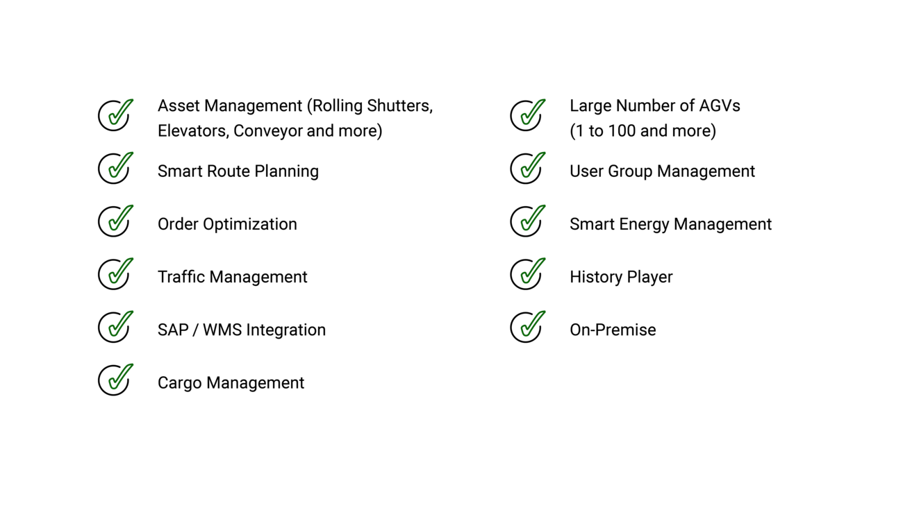 The AGV control system “Transport Manager” is the central intelligence of all automated guided vehicles in your facility. It coordinates all transport orders, plans optimal routes, and monitors the entire vehicle fleet in real time.