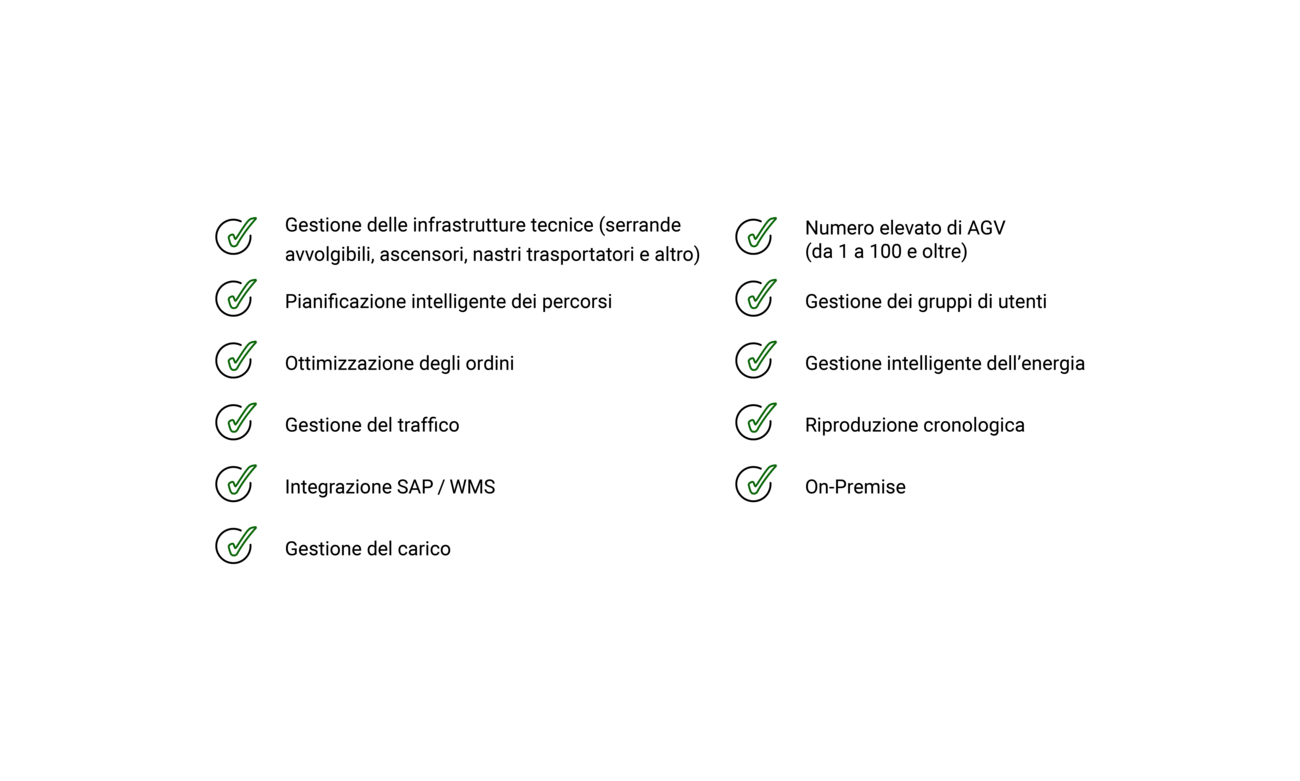 Il sistema di controllo AGV “Transport Manager” è l'intelligenza alla base dei veicoli a guida automatica presenti nella vostra struttura. Coordina tutti gli ordini di trasporto, pianifica i percorsi ottimali e monitora l'intera flotta di veicoli in tempo reale.