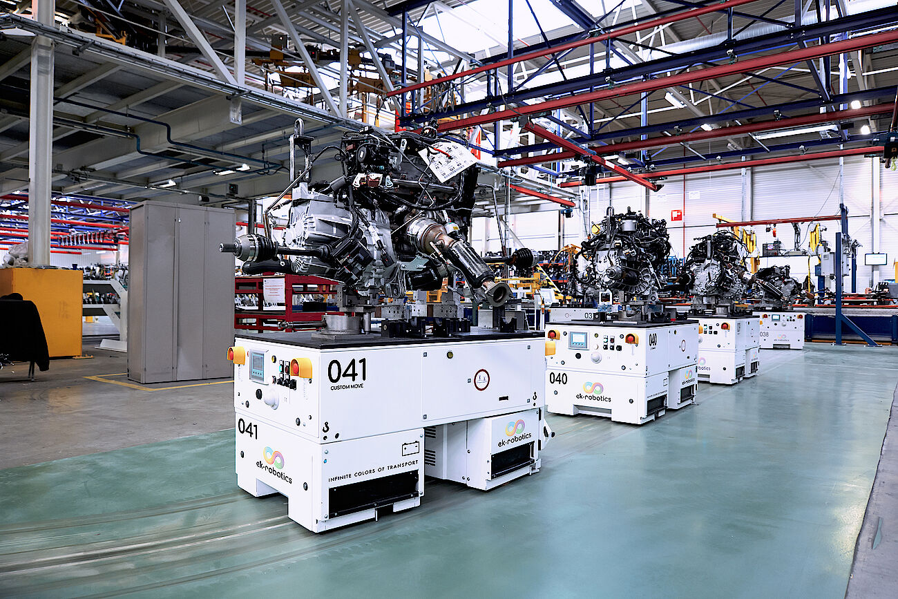 105 Transportroboter des Fahrzeugtyps CUSTOM MOVE hat ek robotics an den Automobilzulieferer SML für den Einsatz in der Montagelinie von Motoren und Achsen ausgeliefert.