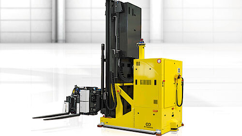 Die flexiblen Fahrwerke ermöglichen Diagonal- und Querfahrten, für die flexible Navigation sorgt die integrierte marktführende Lasertechnologie ohne Bodeninstallationsbedarf. Unser Batteriesystem ist variabel und ermöglicht einen automatischen Wechsel beziehungsweise Nachladung. Für eine effektive Unfallprävention können individuelle Sicherheitspakete installiert werden. Eine Zuladung von bis zu 12.000 kg ist problemlos möglich.