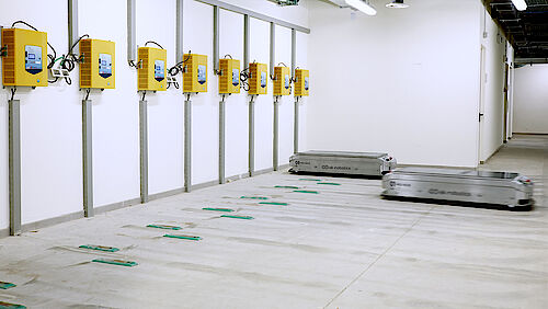The automatic fast-charging system for lithium-ion batteries ensures that your transport robots work reliably without manual intervention – even in multi-shift operation. Strategically placed charging stations enable intermediate charging during idle periods and keep your AGV fleet operational around the clock.